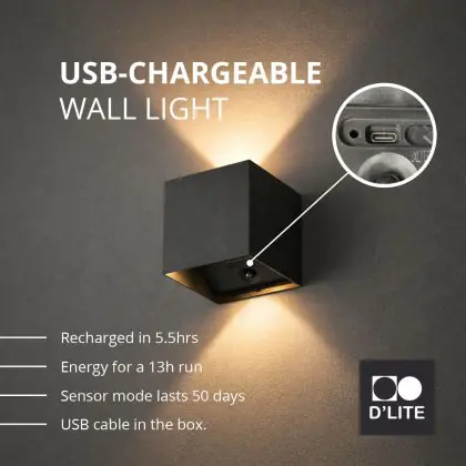 Verbeter de sfeer van je buitenruimte met de D'Lite LED Wandlamp Elingen Up & Down – op batterij. Deze moderne wandlamp straalt warm licht uit (3000K) naar boven én naar beneden, wat zorgt voor een stijlvol lichteffect op gevels en muren. Dankzij de ingebouwde oplaadbare batterij en geïntegreerde daglichtsensor werkt de lamp volledig draadloos en schakelt hij automatisch in wanneer dat nodig is. Met een IP65-classificatie is deze lamp bestand tegen diverse weersomstandigheden, waardoor hij perfect geschikt is voor langdurig buitengebruik.