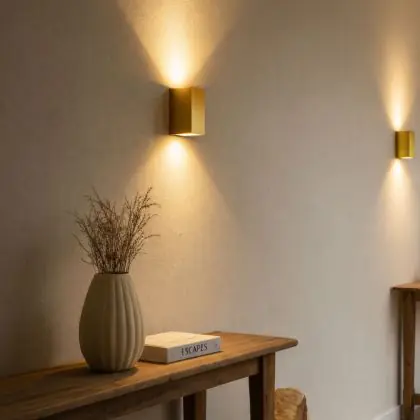 Beschrijving D'Lite Wandlamp Vrebos Aluminium Goud Up&Down| IP54 - Geschikt voor 2x GU10