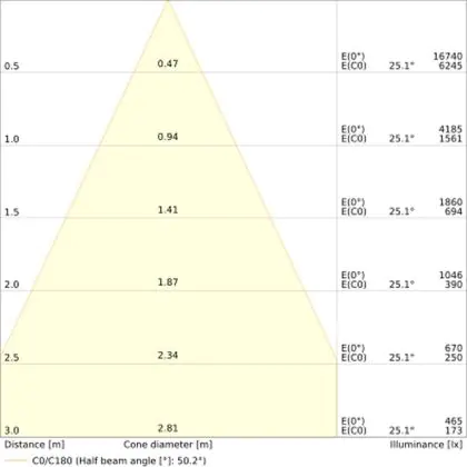 De gradenbundel geeft informatie over hoe breed het licht wordt uitgestraald. Dit zit tussen de 0 en 360 graden (D). Hoe kleiner de hoek, hoe specifieker de lichtbundel is. Over het algemeen is een smalle gradenbundel perfect voor sfeer- of accentverlichting, terwijl een brede gradenbundel ideaal is om grote oppervlaktes te verlichten.