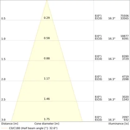 De gradenbundel geeft informatie over hoe breed het licht wordt uitgestraald. Dit zit tussen de 0 en 360 graden (D). Hoe kleiner de hoek, hoe specifieker de lichtbundel is. Over het algemeen is een smalle gradenbundel perfect voor sfeer- of accentverlichting, terwijl een brede gradenbundel ideaal is om grote oppervlaktes te verlichten.