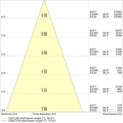 De gradenbundel geeft informatie over hoe breed het licht wordt uitgestraald. Dit zit tussen de 0 en 360 graden (D). Hoe kleiner de hoek, hoe specifieker de lichtbundel is. Over het algemeen is een smalle gradenbundel perfect voor sfeer- of accentverlichting, terwijl een brede gradenbundel ideaal is om grote oppervlaktes te verlichten.