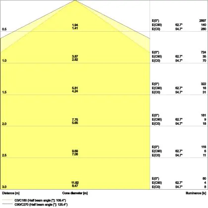 De lichtopbrengst (Lumen), geeft weer hoe krachtig het uitgestraalde licht is. Dit is belangrijk om te weten om de juiste sfeer te creëren. 0 tot 400 Lumen is bij uitstek geschikt voor accent- of sfeerverlichting. Een hoger aantal Lumen is, afhankelijk van de grootte van de ruimte, beter geschikt als ondersteunende- of basisverlichting. Heb je plafonds hoger dan 4 meter, dan is een lichtopbrengst van minimaal 8000lm aan te raden indien heldere verliching gewenst is (vb. in werkomgevingen).